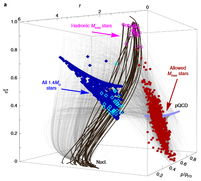 Wow, a 3-D graph with perspective. This actually makes sense. The vertical axis is the speed of sound, an unknown. A second axis is pressure, directly related to star mass. The third axis is gamma, whatever that is. A 1.4 solar mass neutron star is hadronic, ie. made of neutrons. A 2 solar mass maximum mass neutron star is too dense to be composed of neutrons.