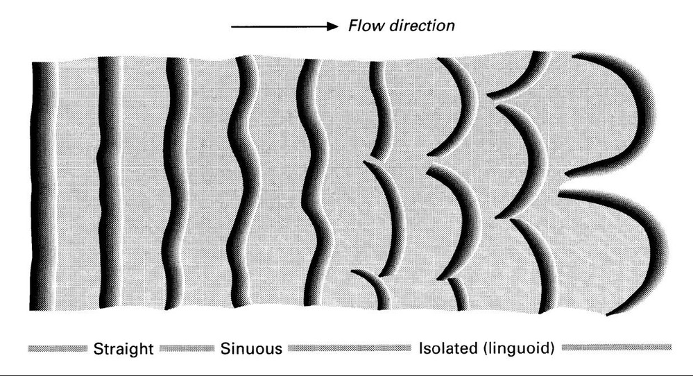 They are described in one article as “decameter-scale, sinuous-crested, eolian sand dunes migrating approximately perpendicular to the face of the outcrop”.