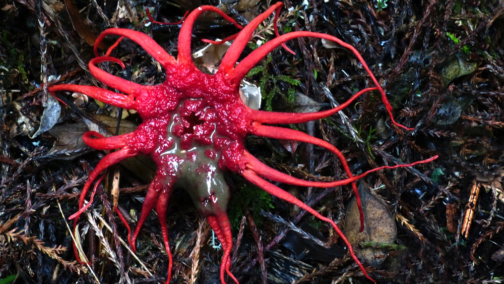 Clathrus archeri (synonyms Lysurus archeri, Anthurus archeri, Pseudocolus archeri), commonly known as octopus stinkhorn, or devil’s fingers, is a fungus which has a global distribution. The young fungus erupts from a suberumpent egg by forming into four to seven elongated slender arms initially erect and attached at the top. The arms then unfold to reveal a pinkish-red interior covered with a dark-olive spore-containing gleba. In maturity it smells like putrid flesh.