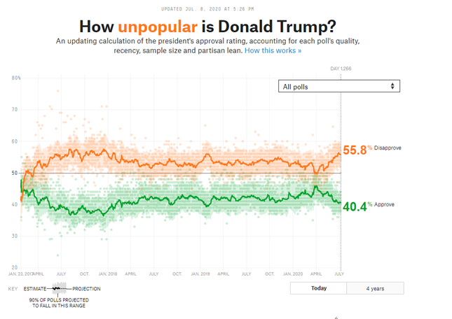 His net approval level is -15.4%. No President in the “modern polling era” (ie since WW2) has come back to win a second term from such a poor position 4 months out from the election.