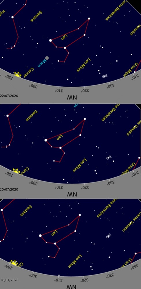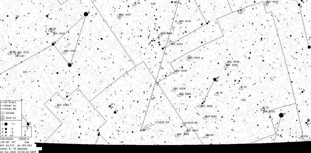 “The earliest opportunity for southerners to see the fading comet will be around early evening on July 26, very low on the northwestern horizon. It could appear 4th magnitude. Hopefully it will have developed a bright dust tail, visible in binoculars. By August 1, the comet has rapidly gained altitude and will be 15 degrees altitude at end of astronomical twilight from 35S, situated near the Coma Berenices star cluster Melotte 111, and shining at 5th magnitude.”