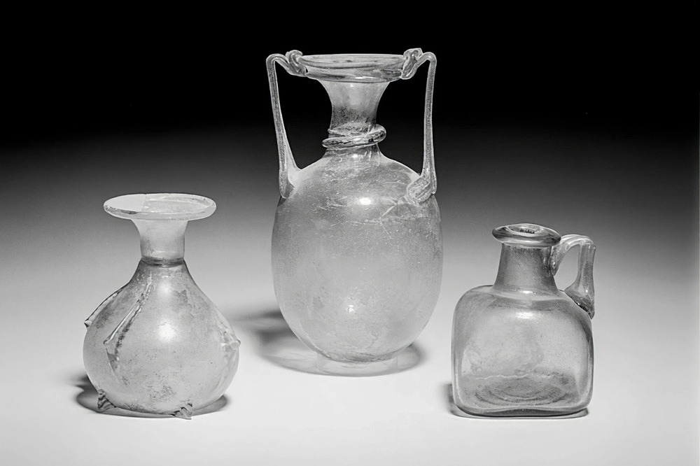 Glass receptacles recovered from Egypt dating to the first or second century A.D., during the Roman occupation.