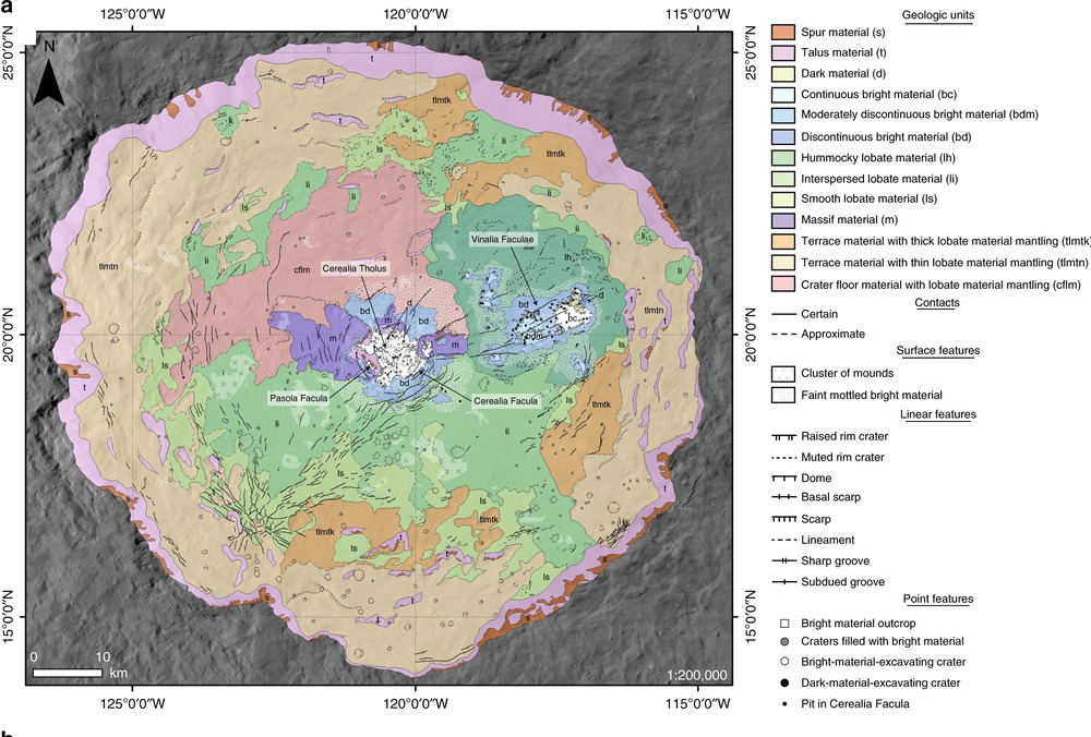 “the central faculae were sourced in an impact-induced melt chamber, with a contribution from the deep brine reservoir, while the Vinalia Faculae were sourced by the deep brine reservoir alone.” – Open access.