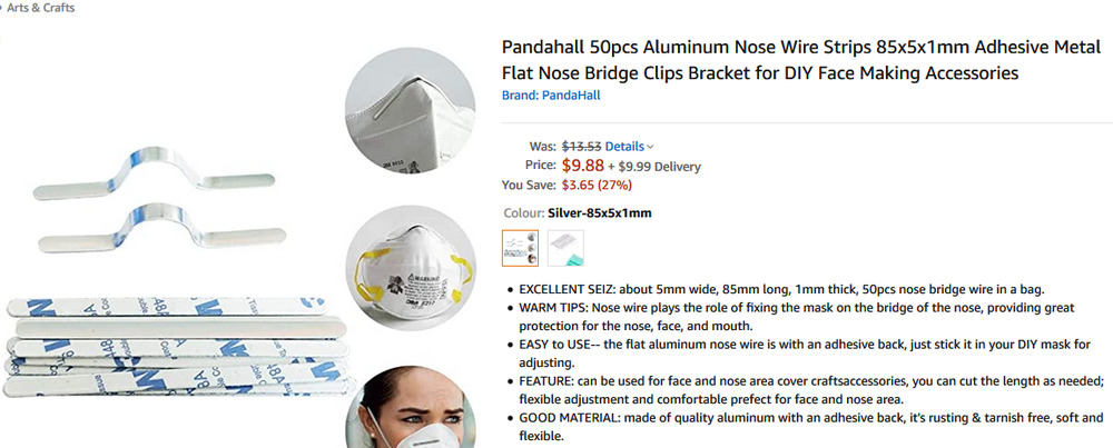 I see on the web that there is such a thing as “nose wire” made of aluminium specifically for use in making masks. I don’t trust it to be strong enough, or the right shape. They are advertised as “can be bent easily”, which is definitely not what I want. These wires have a rectangular cross section, 5 mm by 0.5 mm. Aluminium 0.5 mm thick, I’d be frightened to break it with a single touch.