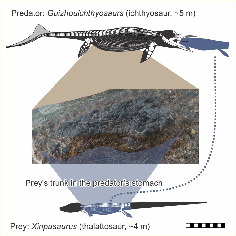 Following the discovery of the ichthyosaur Guizhouichthyosaurus in China, archaeologists noted that the almost 5-m (15-ft)-long fossil had a large bulge in the stomach containing a mass of smaller bones.