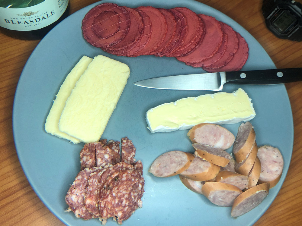 Two King Island cheeses, Victorian salami & kabanos, beetroot water crackers, Langhome Creek SGM.