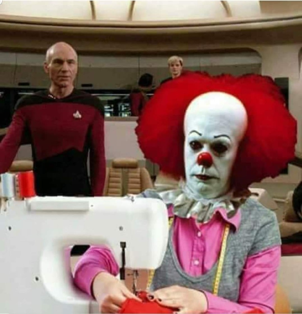 The clown doesn’t want to end up as bald as the fellow behind him, so he’s sewing an extra patch of red hair to go between his existing two tufts.