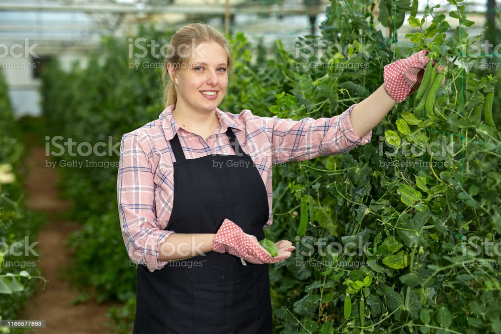 this stock image shows a gardener with her peas