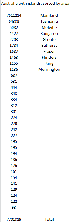 I should be able to get two answers for the land area straight from the spreadsheet I have because I have two datasets of Australia, one from the coast database (low resolution) and one from the database of countries (high resolution). The low res version does have the islands but I have to calculate and add them separately. The country database has most islands together, but some island groups separate.