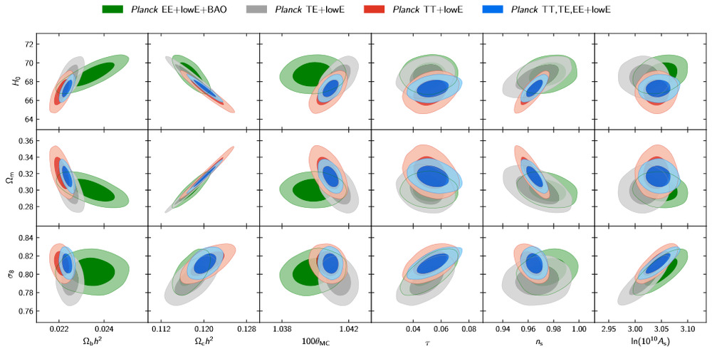 We’ve had several threads recently about disagreement over the value of the Hubble constant. Have a look at the top row in the next chart, the Hubble constant is H_0. As for disagreement, there isn’t any. The value is in the range of 67 to 68 km/s/MPc.
