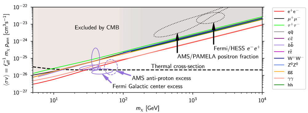The following figure shows the constraint on the dark matter annihilation cross section vs dark matter mass from Planck. Planck data does not rule out the famous Fermi galactic centre excess or the AMS antiproton excess as possible contenders for dark matter annihilation.