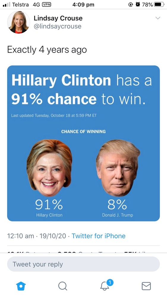 Sheesh, 538 currently has Biden leading by 10.6% and are only giving him an 87% chance. The NYT let its dreams blow out its mind.
