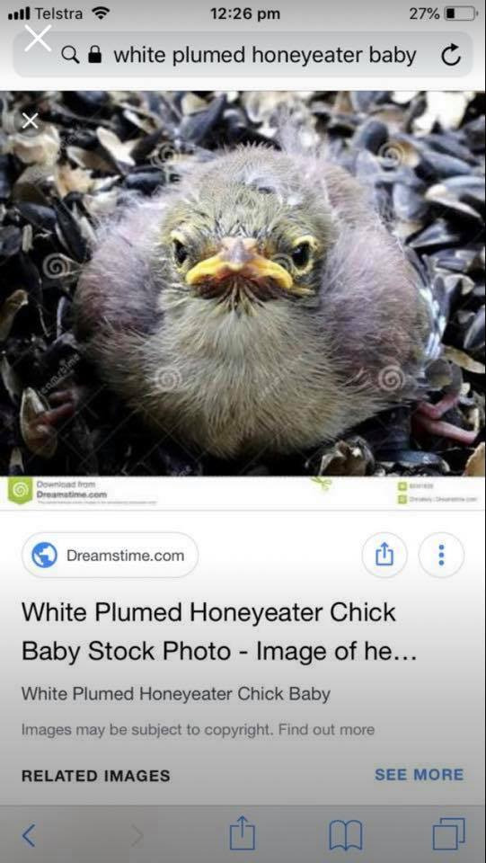 - 1. I got within one metre of a bird, could see all of it easily, looked it in the eye for minutes, and still couldn’t identify it. It was clearly a baby, ‘cheep’ing for its parents, nowhere near old enough to fly for itself but out of the nest and near the top of a tiny tree. It was size of the body of a blue wren. Grey fluff over most of its body, with flight feathers just beginning to be big enough to show colour – striped colour on flight feathers. Not a blue wren because shorter tail slanted downwards, not a finch (red-brow, sparrow, goldfinch, greenfinch) because beak too sharp for that. Not a thornbill because beak too blunt for that. Not a noisy miner or myna because way too small. Help!