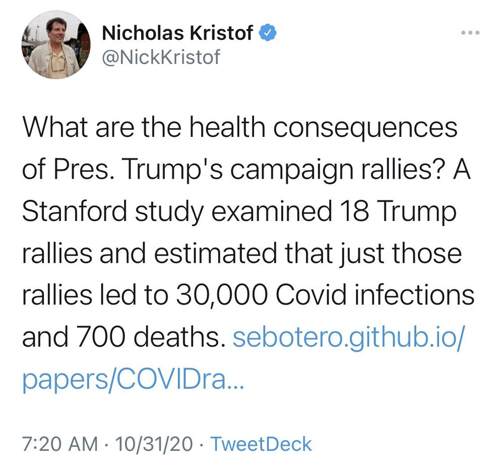 (CNN)President Donald Trump on Friday baselessly claimed that doctors are inflating the coronavirus death count for monetary gain while cases, hospitalizations and deaths surge across the country.“Our doctors get more money if someone dies from Covid. You know that, right? I mean our doctors are very smart people. So what they do is they say ‘I’m sorry but everybody dies of Covid,’ “ Trump said, without citing any evidence, at a rally in Waterford Township, Michigan.