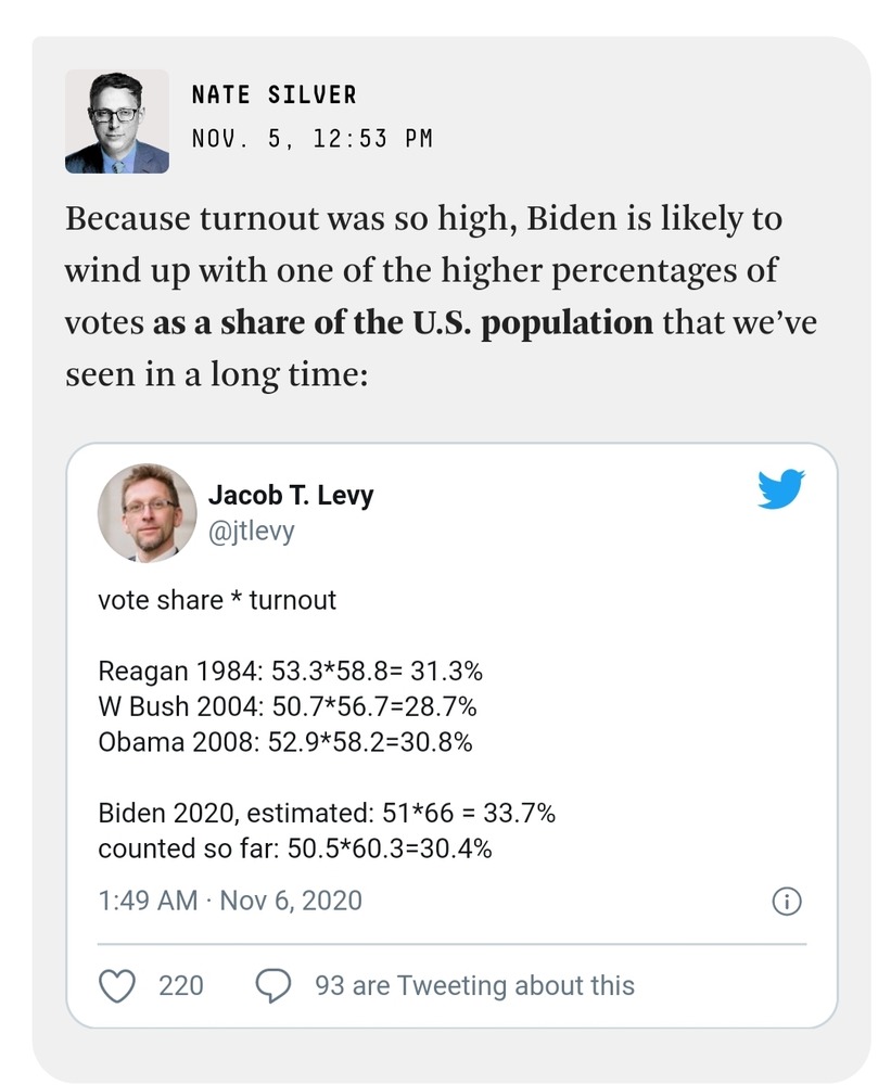 It’s also the highest vote for a candidate as a % of the voter eligible population since 1932, Biden having secured the votes of 34.2% of the VEP.
