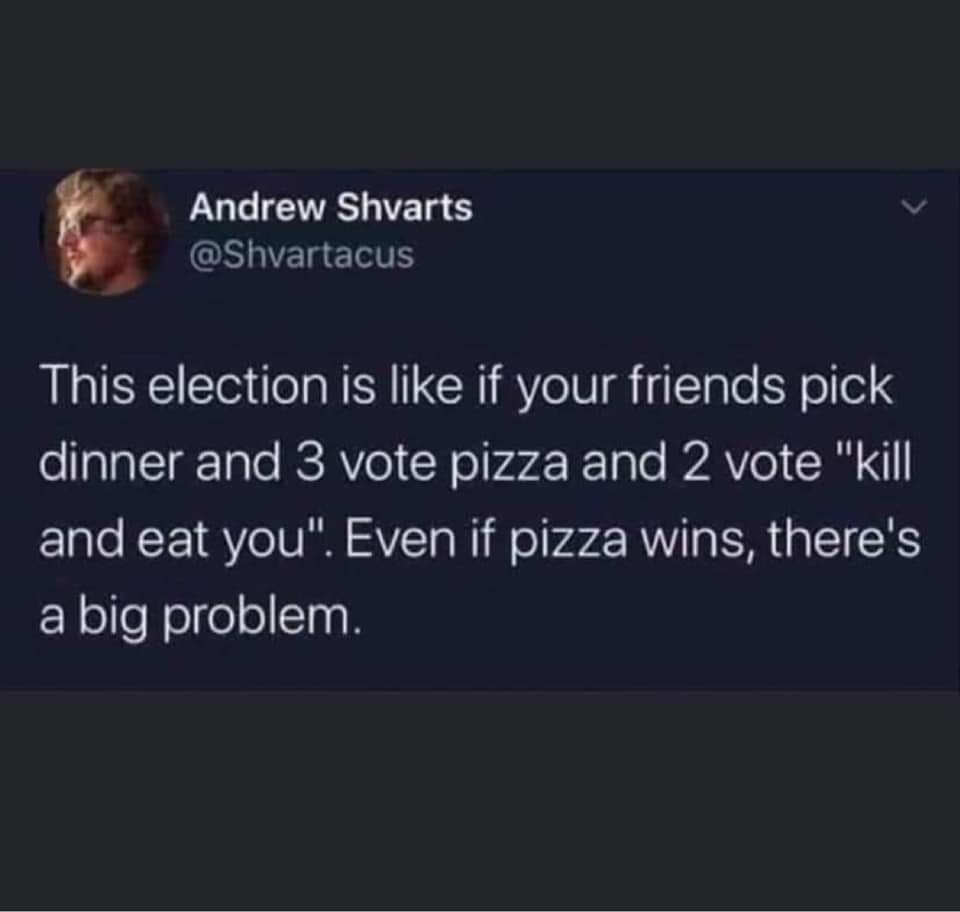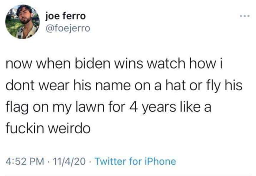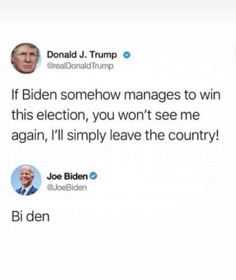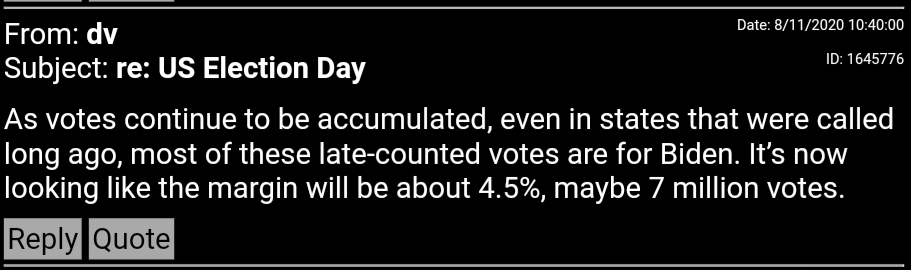 Predictions! Make your predictions here!Will Trump or Biden be victorious? Will Trump claim premature victory? Will the US descend into civil war? Will aliens come forward and say the last four years have been an elaborate hoax?