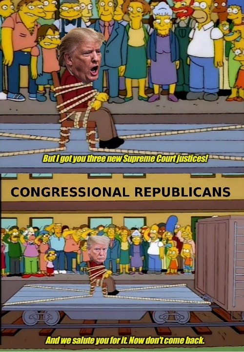 In the end the Republican leadership will abandon Trump after it becomes clear that Democrats both one the senate and the house. Only 10 days after the election will it be generally accepted with only 10% of citizens believing the election was stolen from Trump.