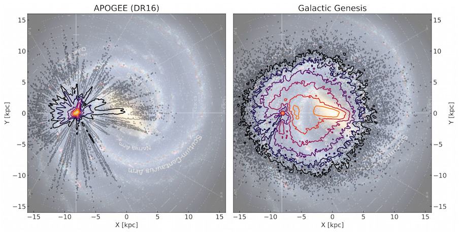 This bit is exciting. The DR16 Apogee data mapped spectra for several percent of the Milky Way (left). SDSS-V aims to map spectra for considerably more than half of the entire Milky Way (right).