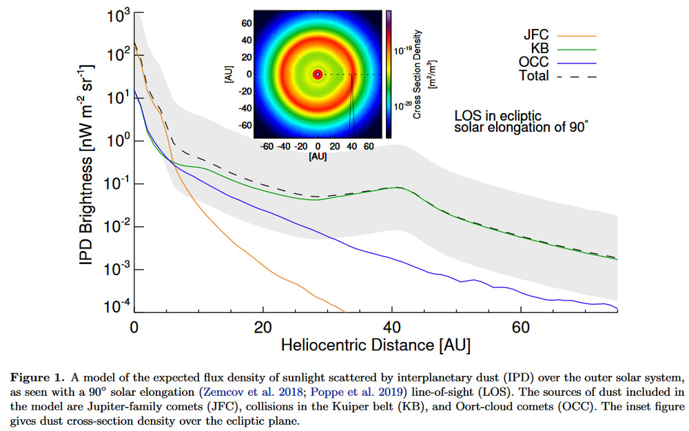 The following figure is predicted brightness from solar system dust. My comment here is that the dust associated with the Oort cloud (OCC) is extremely poorly known.