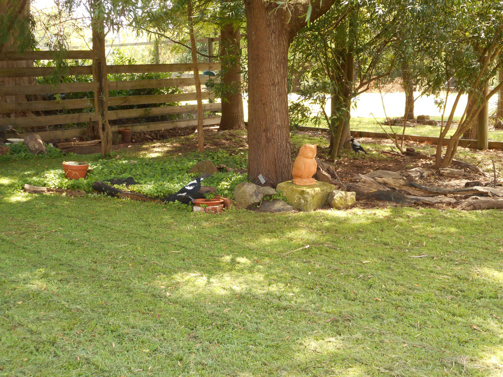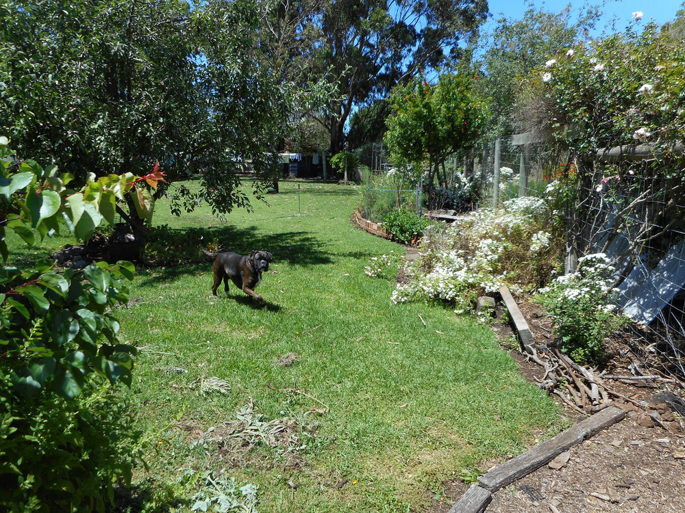 I bin weedinā and maarān agin. This lot of grass is, I think, mostly local grasses. They donāt mind maarn. The lush stuff is Dichondra. It doesnāt mind a high clip either. And it looks good. It stays green there because on really hot days I turn on a low use sprinkler for the birds in that section of garden.
