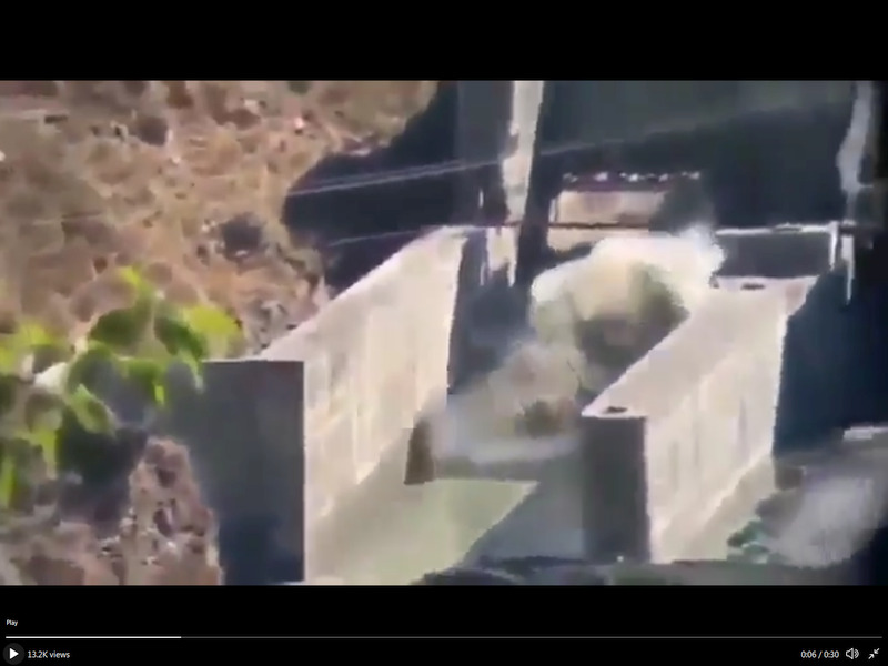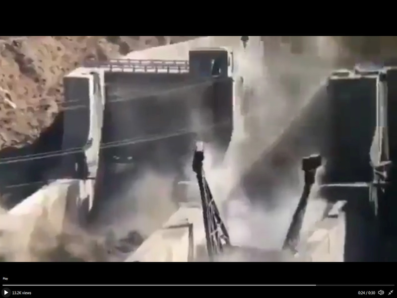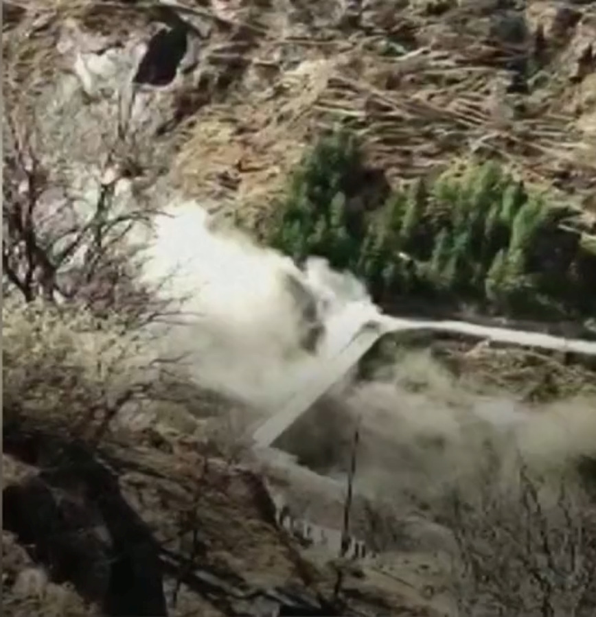 Dam just before the water hit, floodway is top centre. Water filling the floodway. Destruction.