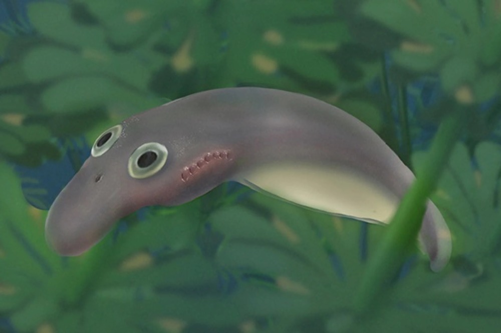 An illustration depicting a prehistoric lamprey hatchling, which looks much more like an adult than modern lamprey larvae