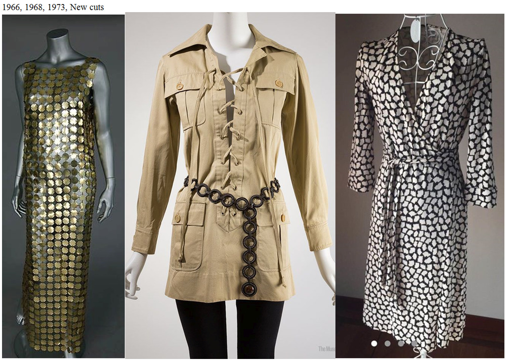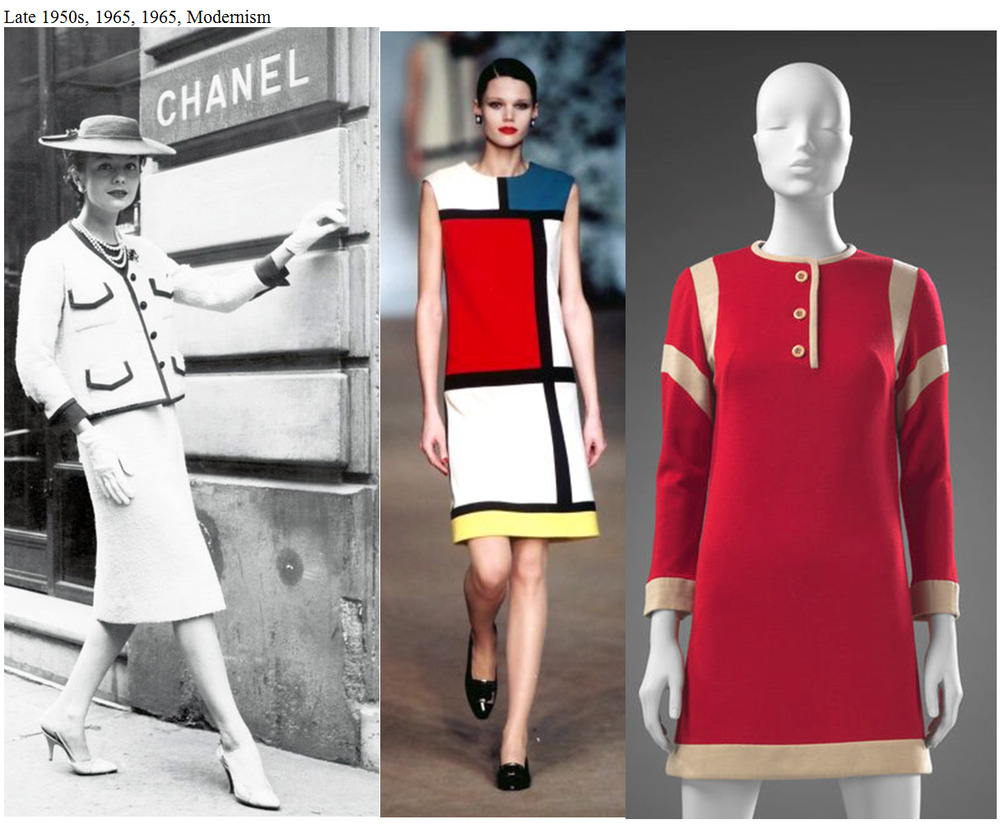 The first milticoloured dress in the book. The collection contains the first without a waist. Embraces synthetic plastics including polyurethane. Does not accentuate feminine curves. Below the knee. The most modernist dress in this book. - 1965 St Laurent, Mondrian dress