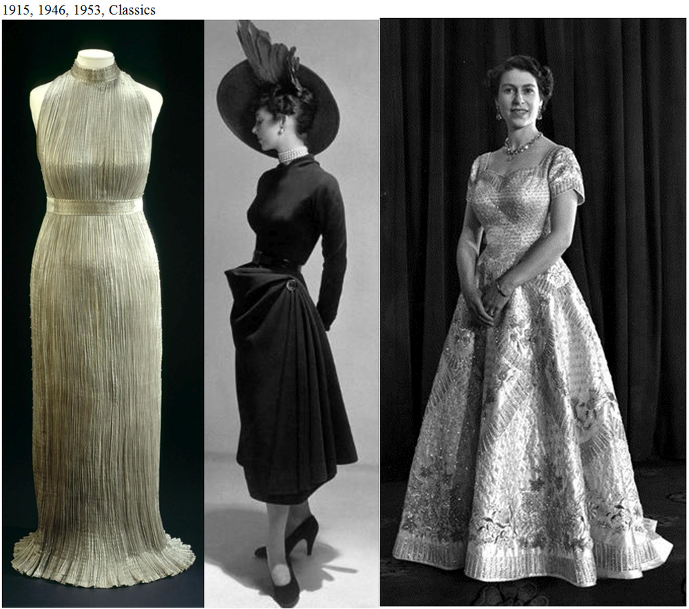 Pioneered the use of the zip, shoulder pad, synthetic fabric, garish monochrome. Old use of flower embroidery. - 1953 Hartnell, Elizabeth II’s coronation