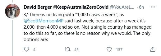 - they know it’s helped us live without COVID-19 a life close to normal (less the generously estimated 20% travel component of The Economy Must Grow) and can see the alternative overseas so are more happy to go ahead with something that lets us live our normal lives