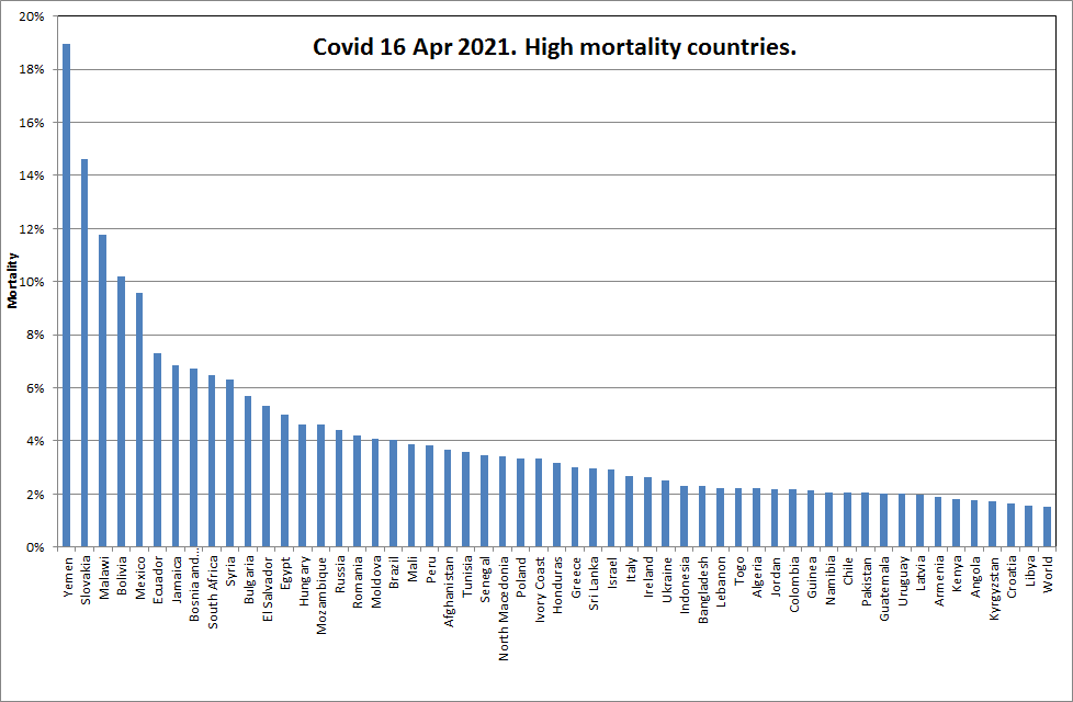 The following chart is approximate current mortality for all countries with a population greater than 1 million and a mortality greater than world average. Values are not all that reliable for small countries like Yemen, and for those countries that only release accurate data one a week.