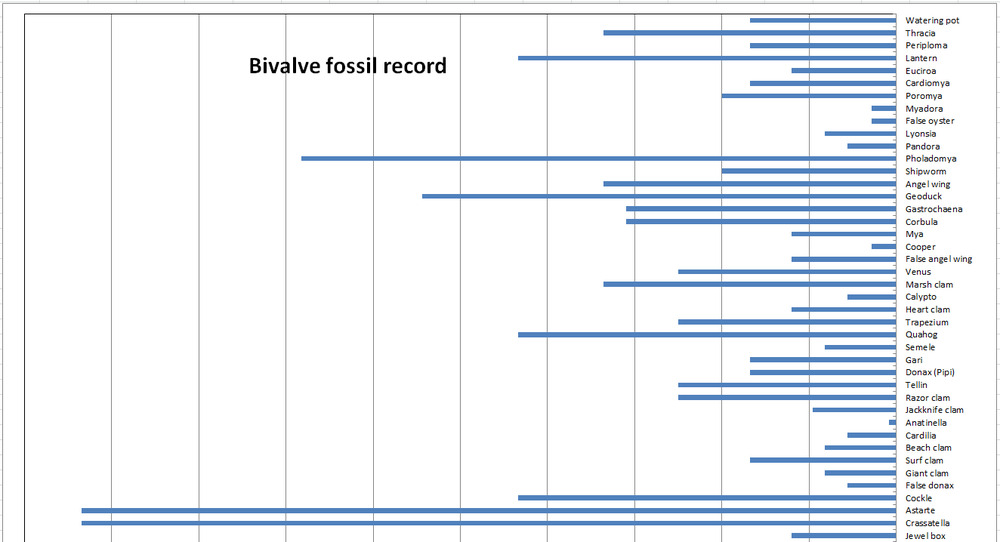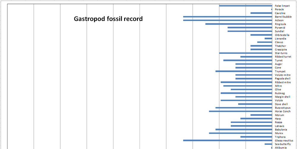 The result is two bar charts, one for gastropods and one for bivalves. I’ve used the common name rather than scientific name for each family. So you can look up “olive” or “tun” or “volute” etc without worrying about declension of the gender of the latin names. This data is old. I copied it out of the book “Encyclopedia of Seashells” and plotted it in Excel.