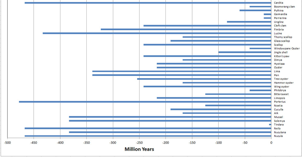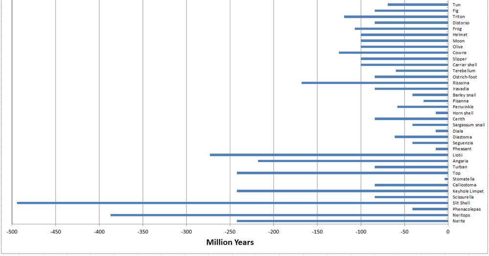 Result. Current extant families go a very long way into the past. Much further back than, for example, dinosaurs. And this is known fossils. The oldest identified fossils of extant mollusk families are of the slit shells. I suspect that that’s not so much because they’re ancestral as because they’re easily identifiable. After that comes the great bivalve radiation.