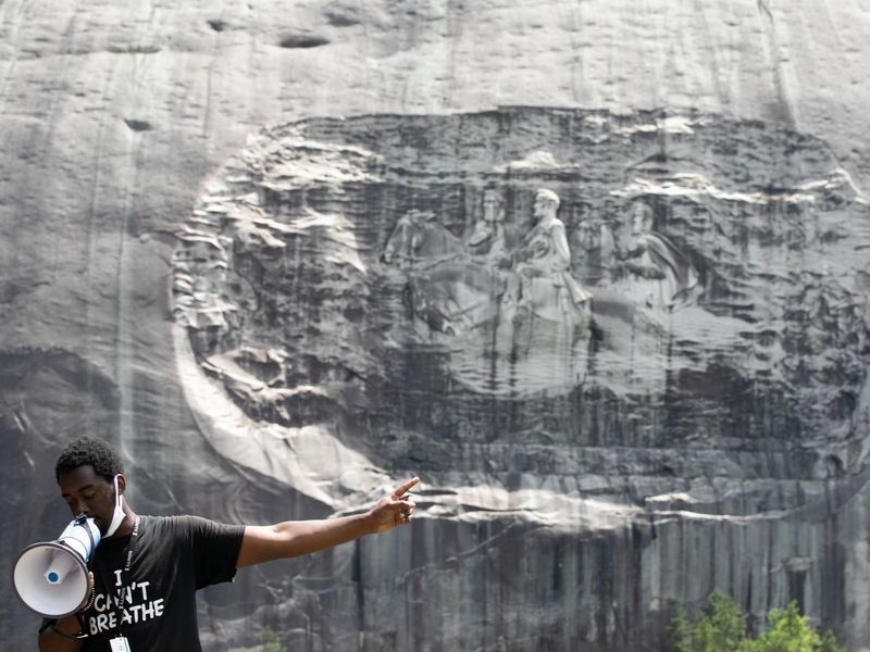 Organizer Quintavious Rhodes addresses Black Lives Matter protesters during a march in Stone Mountain Park on June 16, 2020. Activists have long called for Stone Mountain’s carved relief of Confederate generals to be taken down.