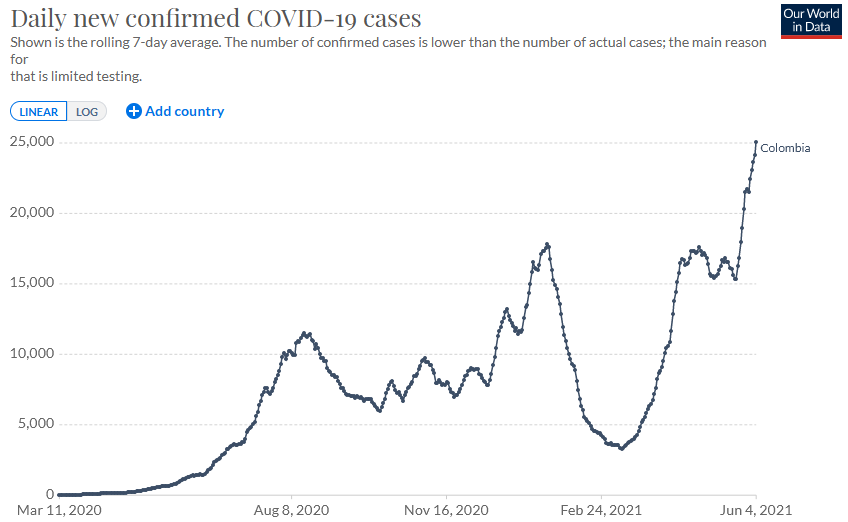 World, daily confirmed Covid deaths per population. See Colombia and Argentina.