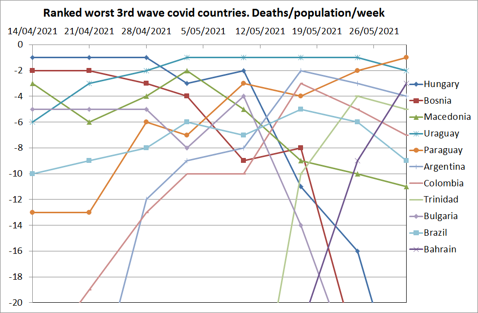 Deaths in the US and UK are back down to average for this time of year. Hungary (and eastern Europe) is declining back after a terrible peak death rate in early May 2021. Brazil, Paraguay and Colombia (and Uruguay) are as bad as ever, twice the normal death toll for this time of year.