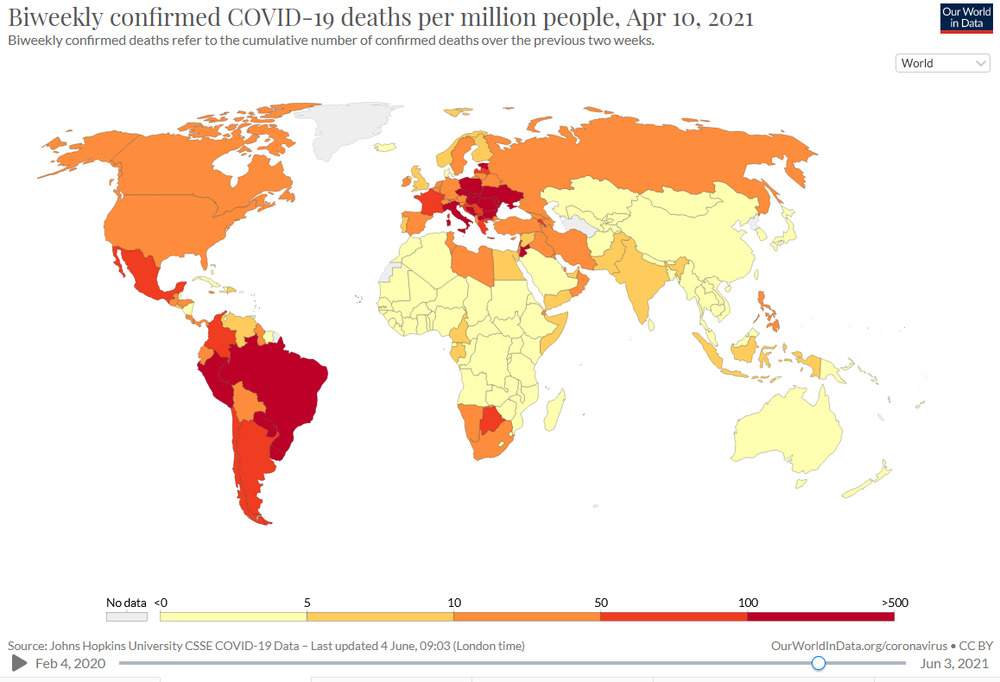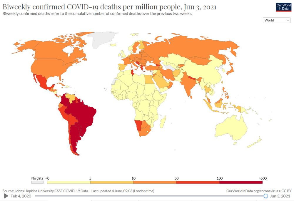 World, daily confirmed Covid deaths per population. See Colombia and Argentina.