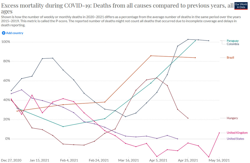 Deaths in the US and UK are back down to average for this time of year. Hungary (and eastern Europe) is declining back after a terrible peak death rate in early May 2021. Brazil, Paraguay and Colombia (and Uruguay) are as bad as ever, twice the normal death toll for this time of year.