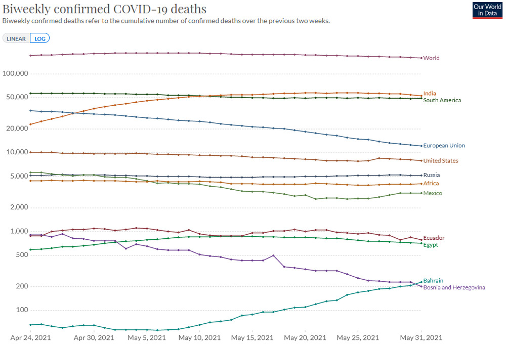 Rising and falling. Rising deaths in India, Nepal, Argentina, Bahrain. Falling deaths in Europe, USA, Bosnia. Europe is the big winner here.