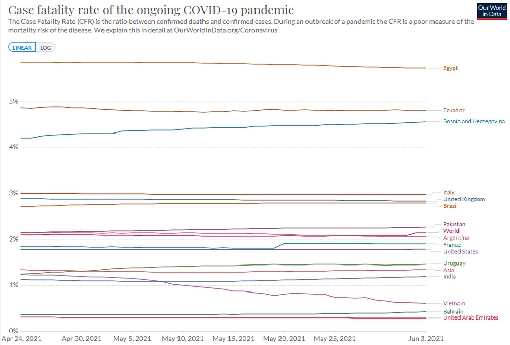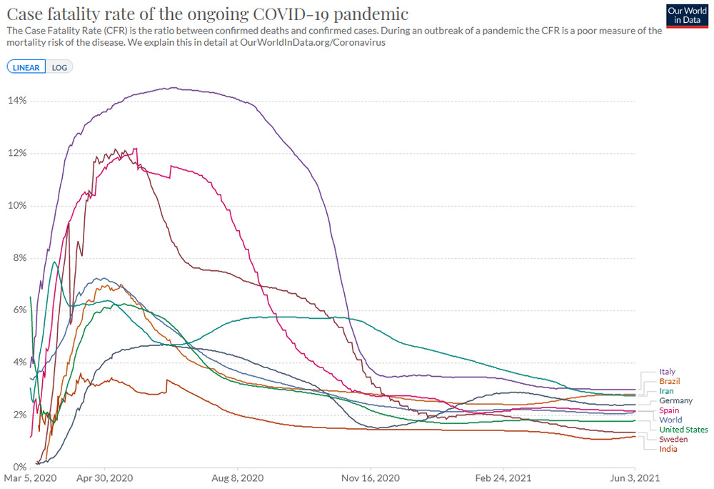 mollwollfumble said:This is interesting. I call this “mortality rate” but they call it “fatality rate”. For 3rd wave Covid in many countries, fatality rates are way down compared to what they used to be. World average now 2%. In first wave China it was 4.1%.