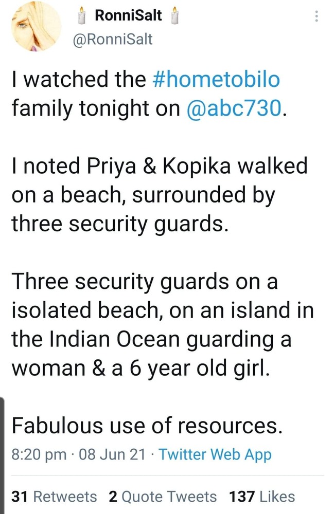 Caving to Biloela Family will set expectation that anyone can spend 3 years locked on an island with a rare blood infectionThe Government says it cannot give in to the demands of those seeking resettlement of the Biloela family in Australia, pointing out that it will set an expectation that anyone who spends three years locked on an island under armed guard while witnessing their three-year-old child contract a life-threatening blood infection and untreated pneumonia will be allowed into the country.