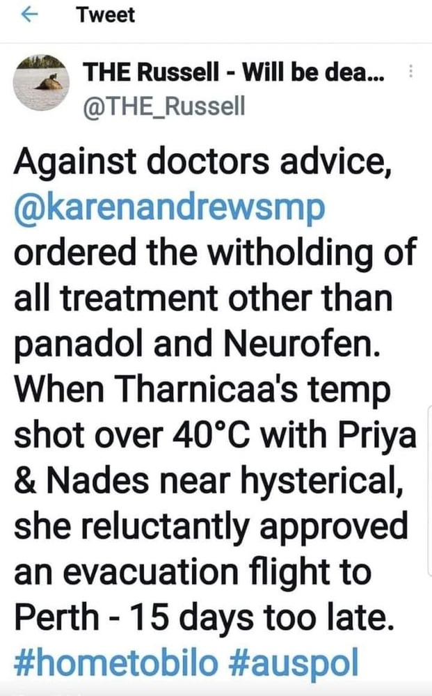 Tharnicaa fell ill on May 25 but her mother said detention staff brushed off requests for her to be taken to hospital, instead giving her Panadol and Nurofen, Ms Fredericks said. When the young girl’s temperature eventually passed 40 degrees, she was given medical attention. After a chest x-ray came back with concerning results a medical evacuation was arranged.And elsewhere, politicians are attempting satire: