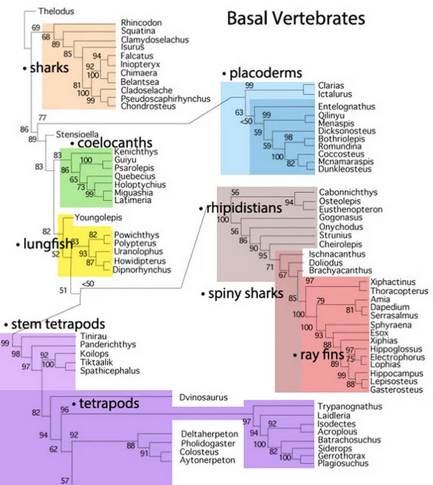 The Clarius, closest relation of the placoderms, are very closely related to Plecos, shown on the chart as Ictalurus. But the skeletal bones of Plecos are less closely related to Entelognathus.