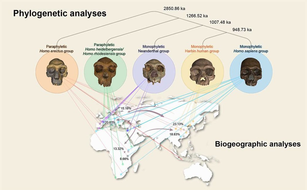 The team generated biogeographic models of Middle Pleistocene human variation, illustrating how different lineages, each descended from a common ancestor, might have evolved according to the fossil record. (Ni et al. / The Innovation)