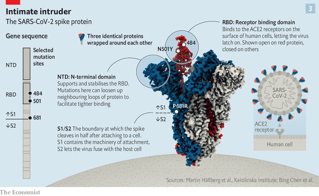 Changes to the rbd can also reduce its susceptibility to antibodies. Antibodies also work by recognising shapes, and though they recognise various other bits of the spike protein, notably another region in the trimer’s head called the n-terminal domain (ntd), the most effective of them are specific to particular aspects of the rbd. Some changes to the rbd, such as n501y, do not make it less recognisable to antibodies. Others, such as e484k, do. Being a lot less susceptible to some antibodies seems to help e484k’s possessors to infect people who have been vaccinated.