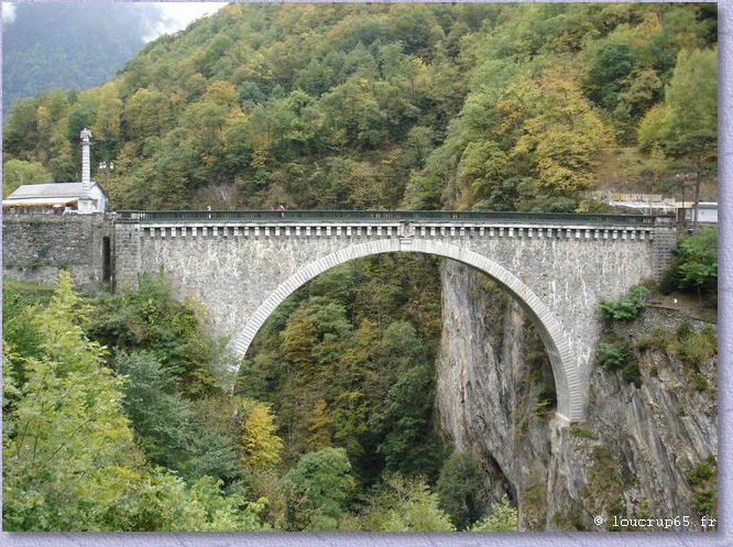 Napoleon III fell in love with the Pyrenees and made several stays in the company of Empress Eugenie. His great work at Saint-Sauveur was the realization of an idea that was dear to him: connecting the two banks of the Gavarnie Gave by building a bridge. An “American” and a “wire” design were considered before finally designing a stone bridge of a single arch. Begun immediately, under the leadership of Mr. Bruniquel, Engineer of Roads and Bridges, the work lasted two years and was completed in June 1861. The deck of the bridge is 68 meters in length, and is located 63 m above the Gave. The arch that supports it is 42 m in diameter. The vault rests directly on the steep rocks that border the Gave. The height of the water level at the base of the vault is 40 m; it is 63 m at the keystone and 65 m at the bridge.