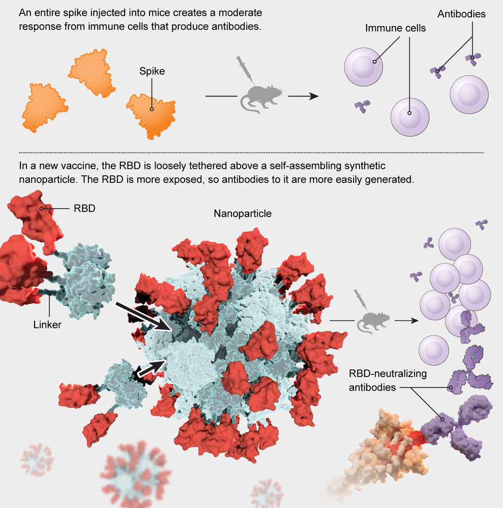 > a nanoparticle sphere displaying 60 copies of the RBD. The scientists also tried something radical: Instead of fusing the RBDs directly to the surface of the nanoparticle, they tethered them with short strings of amino acids, like kites. Giving the RBDs a little bit of play could allow the immune system to get a better look.