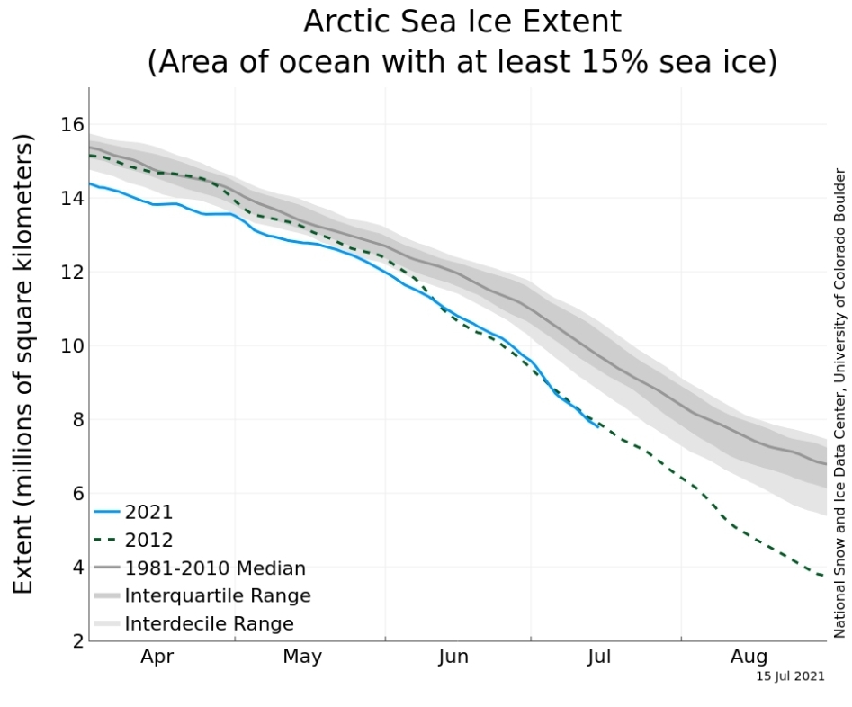 Arctic sea ice extent is slightly below what it was at this time in 2012, which was the year of the record low.