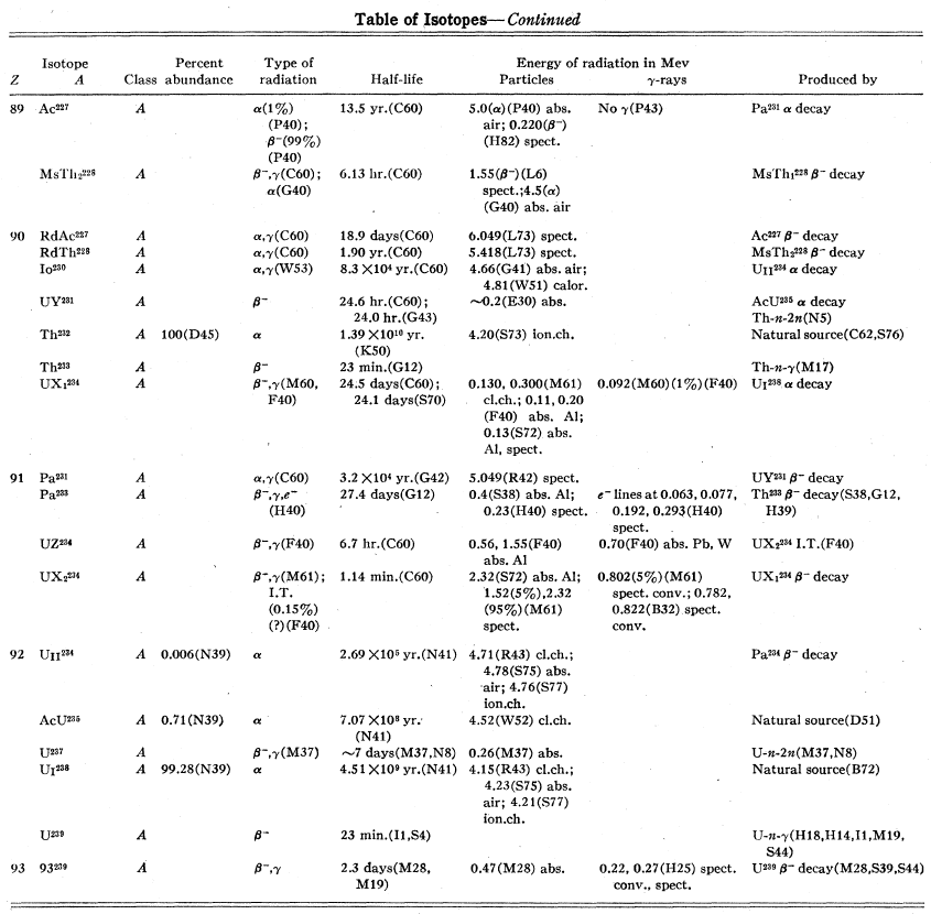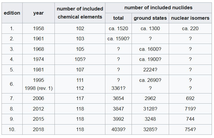The Table of isotopes from 1960 is shown below. Note how it stops at element 101.
