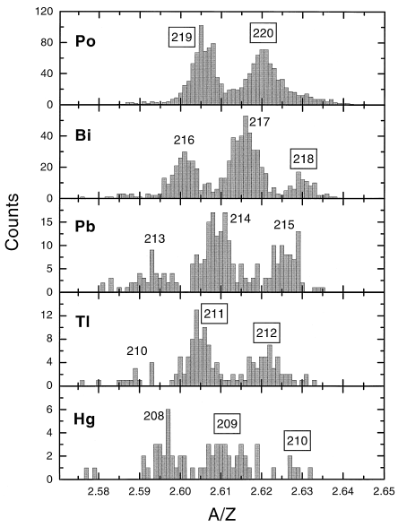 “The atomic number Z and mass-to-charge ratio ArQ of reaction product ions reaching the final focus were determined by combining measurements of time of flight TOF. with information from position-sensitive multi-wire counters and the magnetic field values.”