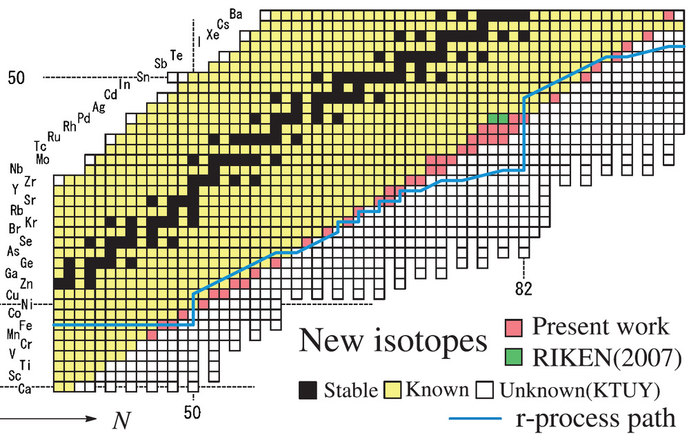 The new isotopes placed on the chart of nuclides. These are all neutron rich. Unusually for an article about finding new isotopes, half lives were not mentioned.